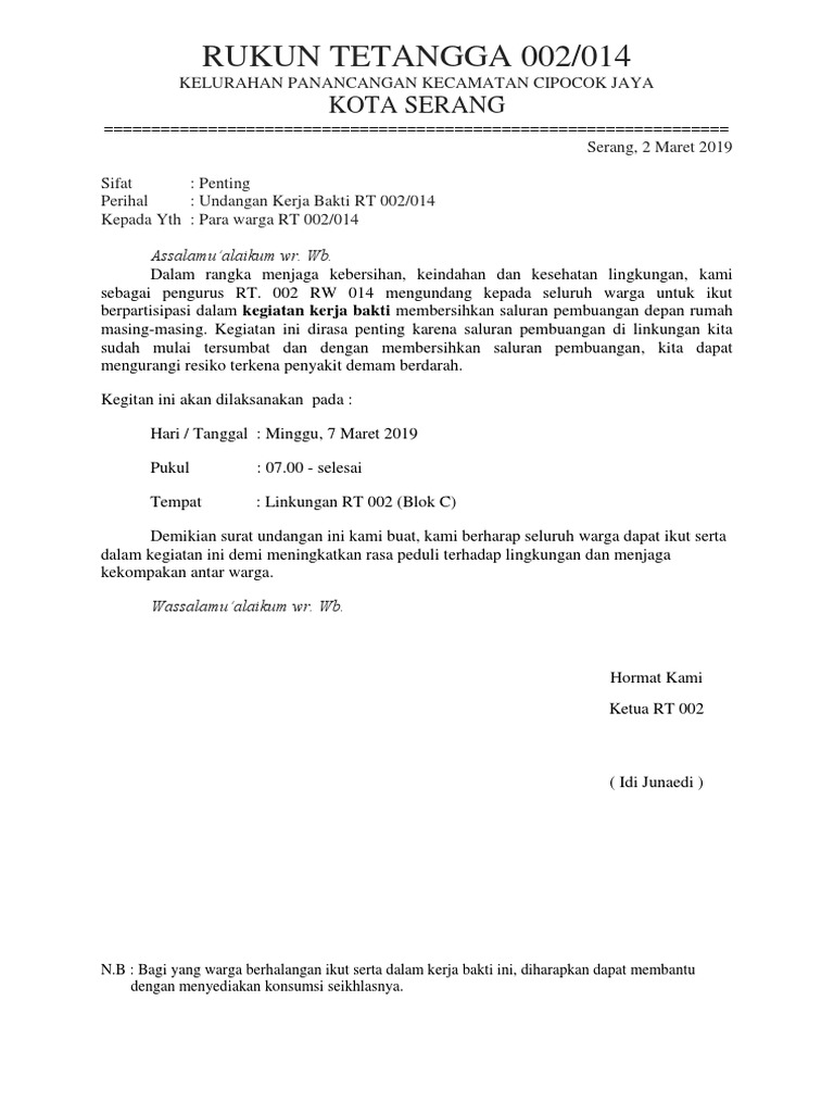 07.00 s/d 09.00 wib tempat : Demikianlah undangan ini kami buat dan atas perhatiannya kami ucapkan terima kasih. Warga rt 03 rw 07 lingkungan jarakan di tempat. Buat temen2 yang mau tanya, mau share tentang program magang bakti bca silahkan. 07 demikian undangan ini kami sampaikan, atas kerjasama yang baik dan semangat kekeluargaan dalam menjaga lingkungan yang aman dan sehat, kami ucapkan terima kasih. Ditulis pada januari 18, 2014 oleh rtnam. Boleh berfoto sambil bekerja bakti. Savesave surat undangan kerja bakti.docx for later. Surat ini cukup simpel namun tetap harus memperhatikan format penulisan maupun kalimat yang tersusun. Text of surat undangan kerja bakti rt.rtf. Kerja bakti bukanlah sebuah kegiatan favorit banyak orang. Buka microsoft excel, kemudian buatl daftar nama dan alamat menggunakan lembar kerja excel. Kemudian upload di grup medsos warga rt, pasti anggota grup pada heboh.